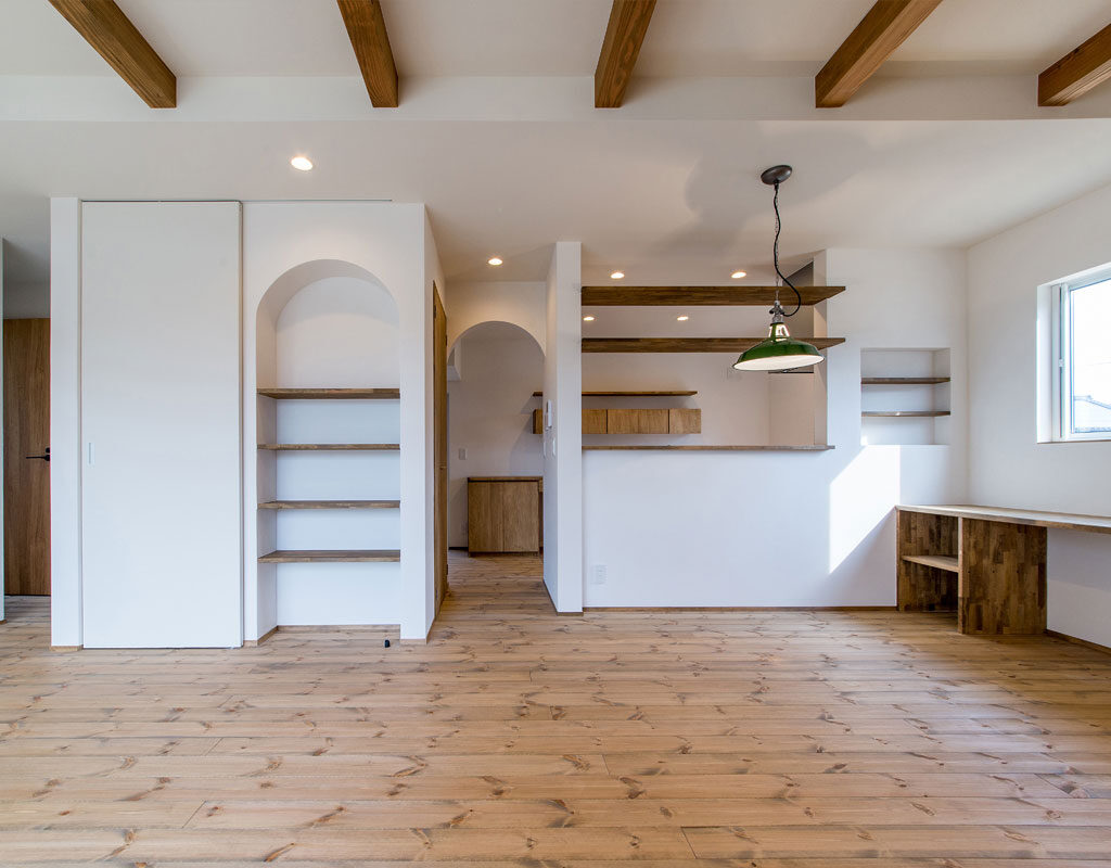 自然素材やタイル、アーチ形の入り口、つくりつけの多目的カウンターなど、1F家族団らんの空間は雑貨好きの奥様の好きなカフェテイスト。