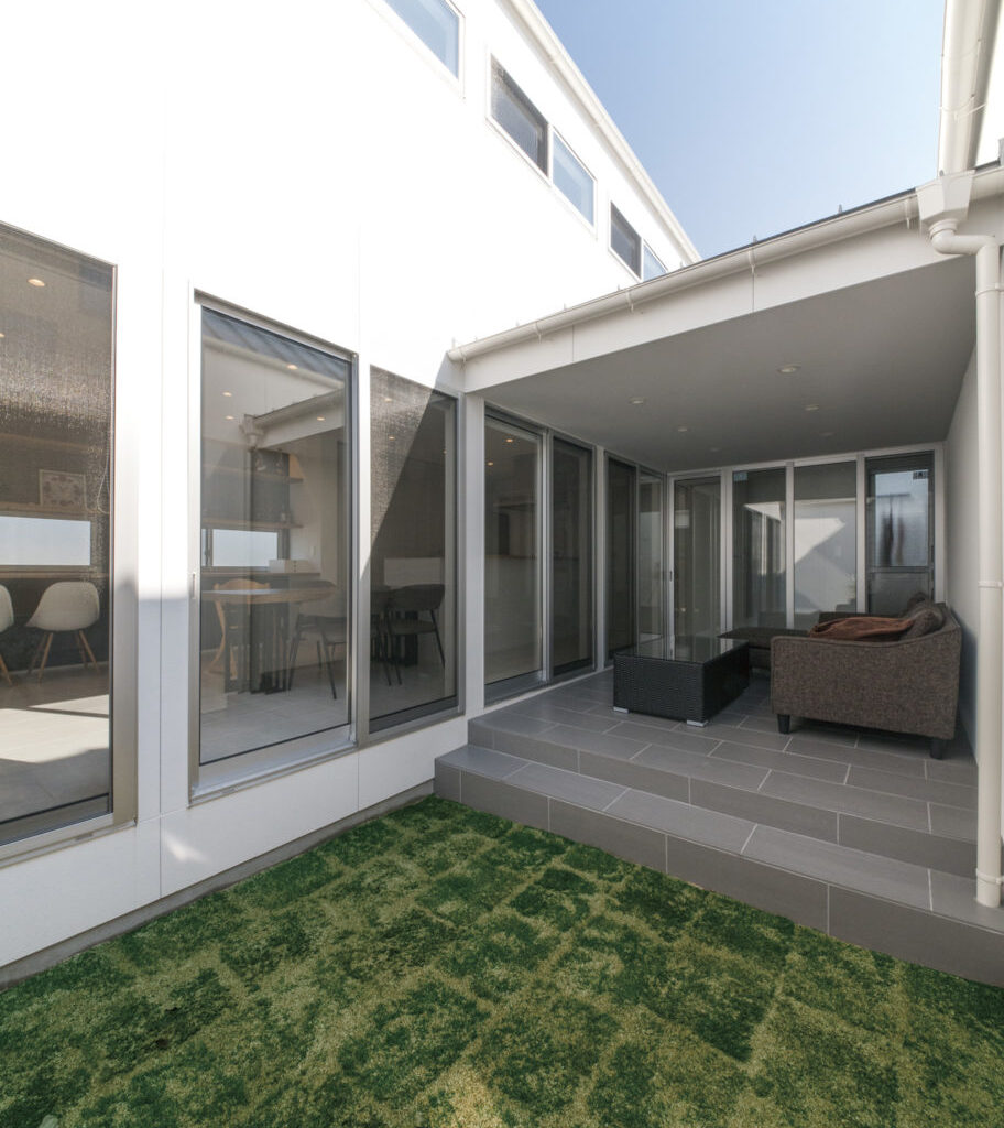 2つの建物に挟まれた中庭のグリーンに面した屋根付きのテラスから眺める奥行きのある空間は、日常を忘れさせてくれます。