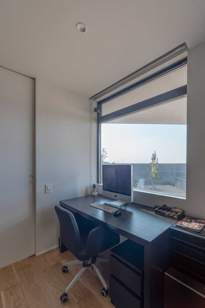 海を眺められるロケーションを生かすため2階に設けたリビングを中心に洗面、寝室、子供部屋を配した間取り。