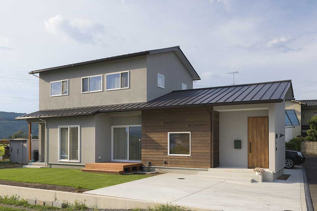 グレーとブラウンの落ち着いた外壁、手入れの行き届いた芝生のグリーンが田園風景の一部として映えます。
