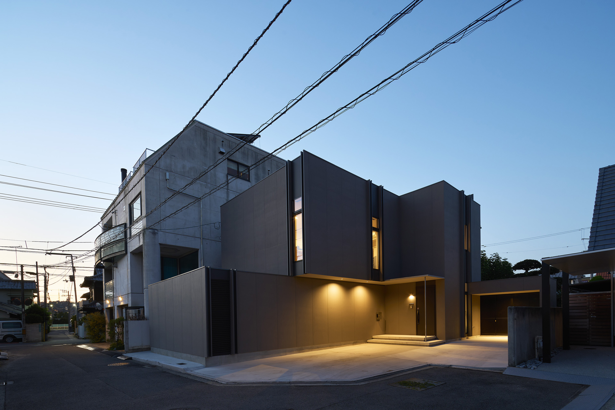 また、外壁の色あいをややトーンを抑えたグレーとすることで住宅街の中での調和と存在感のバランスを調整しています。